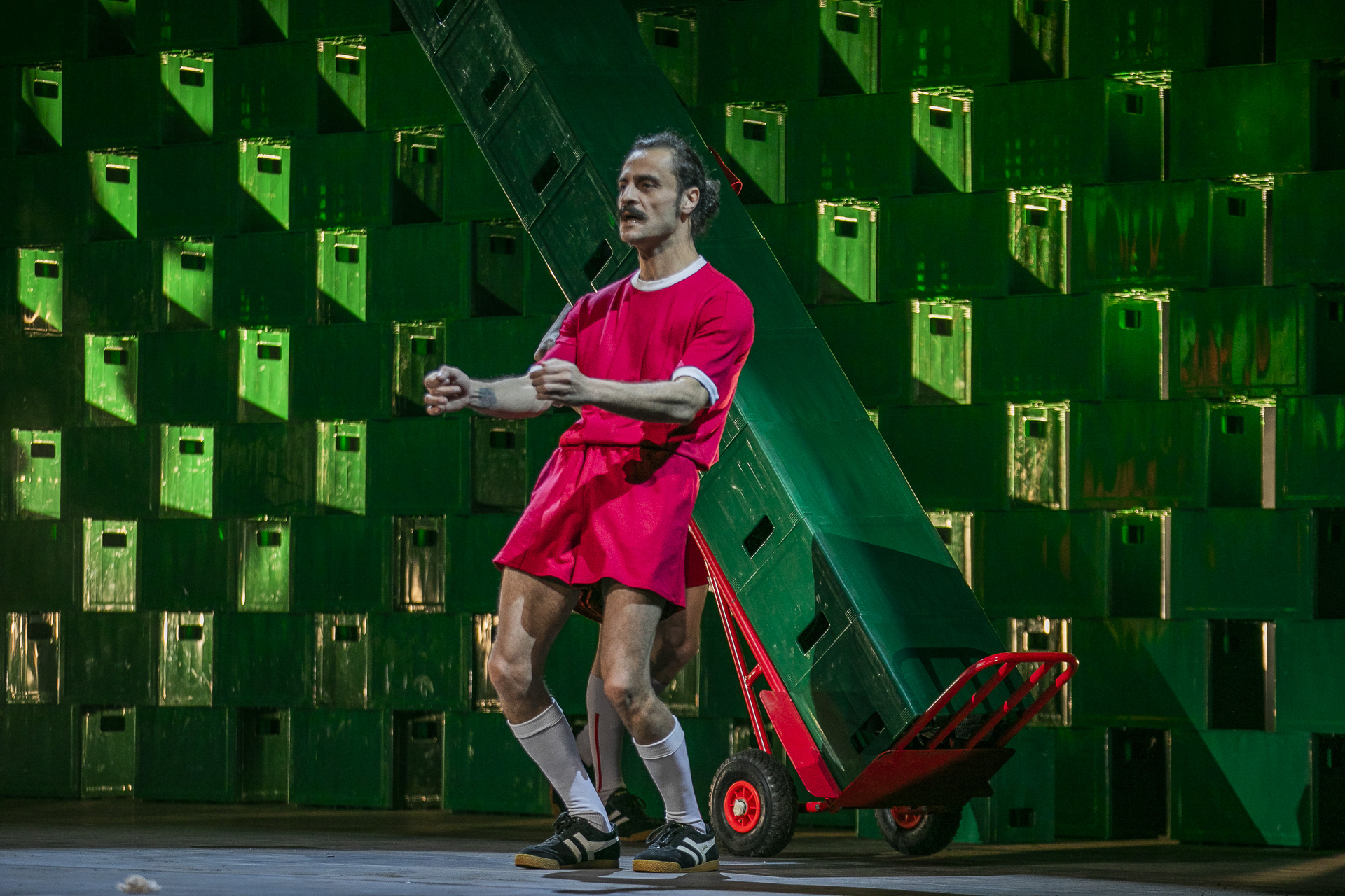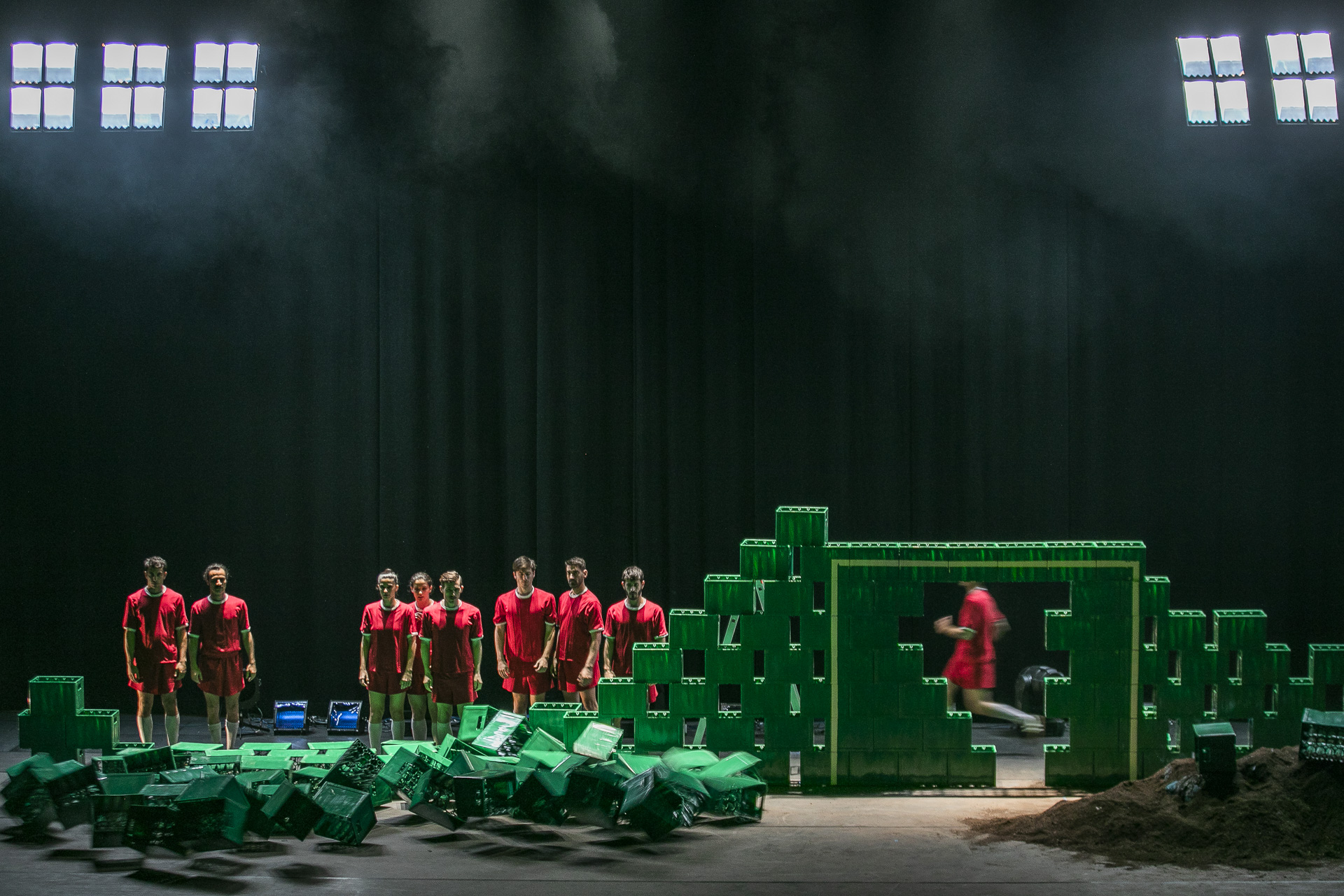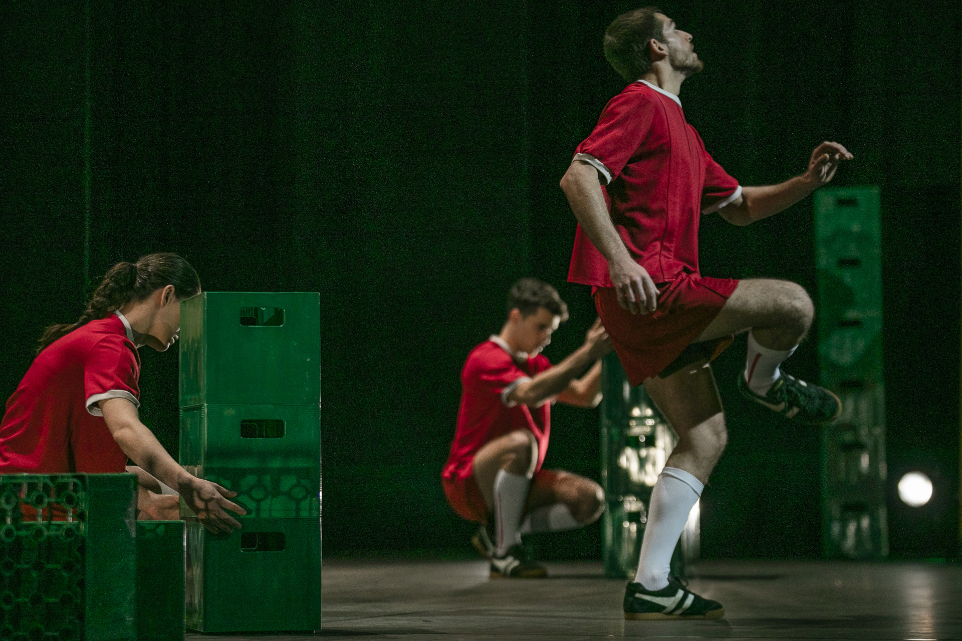 Driven by similar concerns, the eleven-member Stereo Nero Dance Co. and the choreographer Evi Souli have created a performance rooted in soccer’s fast footwork, short sharp breaths, shoots, dribbles, passes, marking, and tackles. Both literally, and metaphorically. Because in “442 or a Game Without Score”, the multi-dimensional world that manifests around the black-and-white goddess that is the soccer ball unfolds like a game of constantly shifting dynamics, arrangements, and formations.