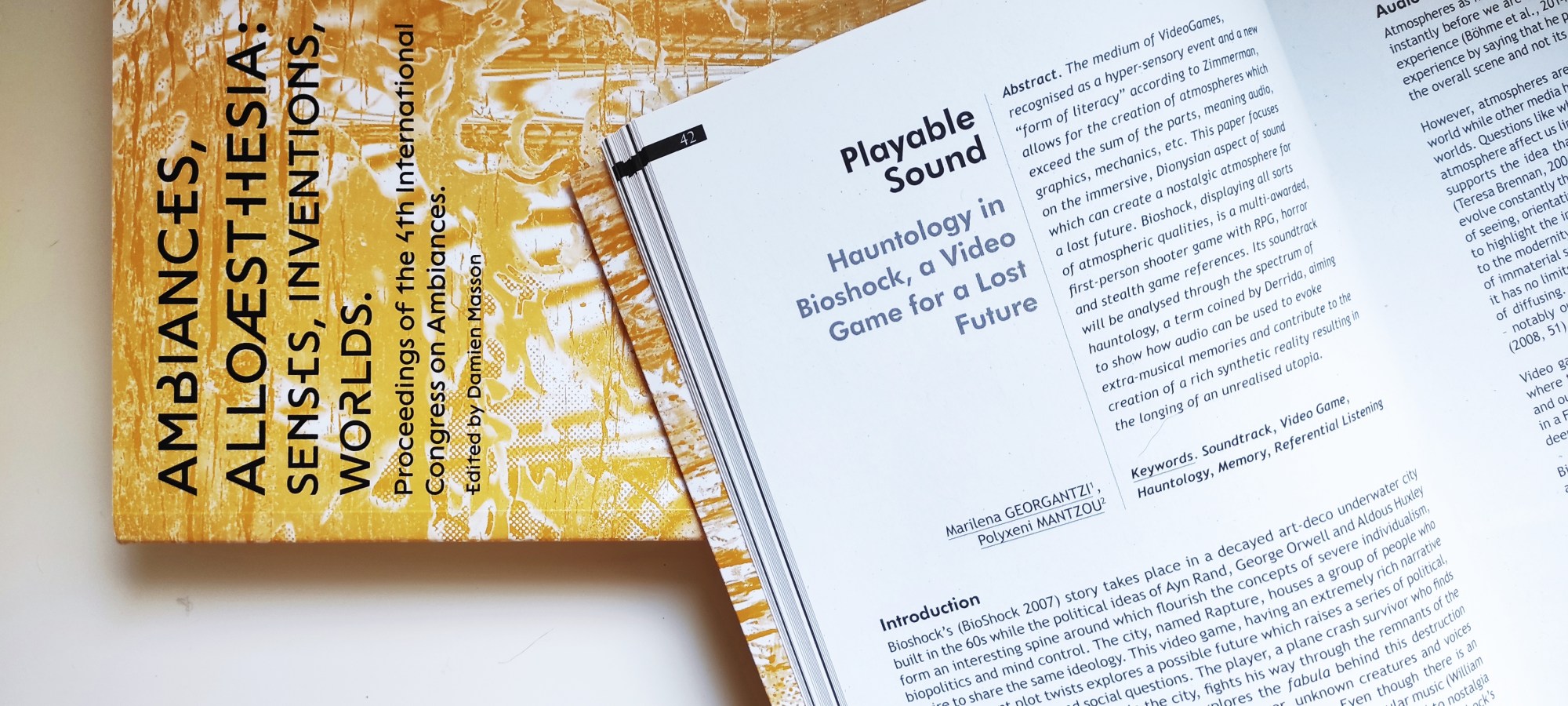 The medium of VideoGames, recognised as a hyper-sensory event and a new “form of literacy” according to Zimmerman, allows for the creation of atmospheres which exceed the sum of the parts, meaning audio, graphics, mechanics etc. This paper focuses on the immersive, Dionysian aspect of sound which can create a nostalgic atmosphere for a lost future. Bioshock, displaying all sorts of atmospheric qualities, is a multi-awarded, first-person shooter game with RPG, horror and stealth game references. Its soundtrack will be analysed through the spectrum of hauntology, a term coined by Derrida, aiming to show how audio can be used to evoke extra-musical memories and contribute to the creation of a rich synthetic reality resulting in the longing of an unrealised utopia.