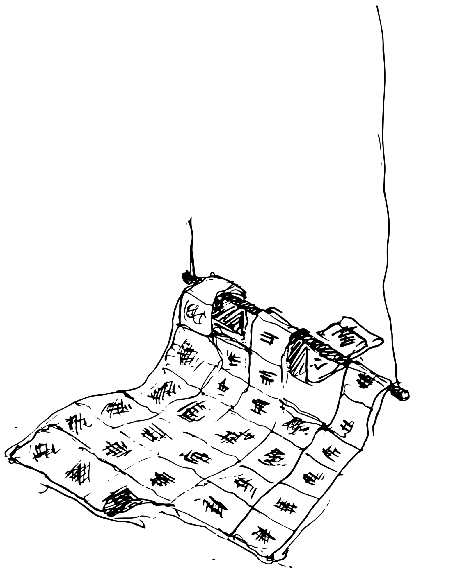“RANDOM-ACCESS MEMORY” takes place in a landscape of memories and collectibles that the performer have cherished for years. The objects are housed in a quilt based on the traditional techniques of quilting and patchwork. These techniques which flourished from the 19th century in America and Canada, allow, through the stitching of pieces, for the creation of collage coverings for sleeping. The symbolic shapes that adorn them carry individual or collective memories and beliefs. The central theme of a quilt, having the role of recording and telling stories through female perception, is analyzed in a grid where each subdivision is a separate creation. The structure of patchwork refers to the concept of the pixel as well as the sticky post-it but its functionality is also related to hypnosis, acting as a metaphor of hibernate, a digital inactivation, but also of non-linear memory, non-serial data recording where access to these are done randomly.